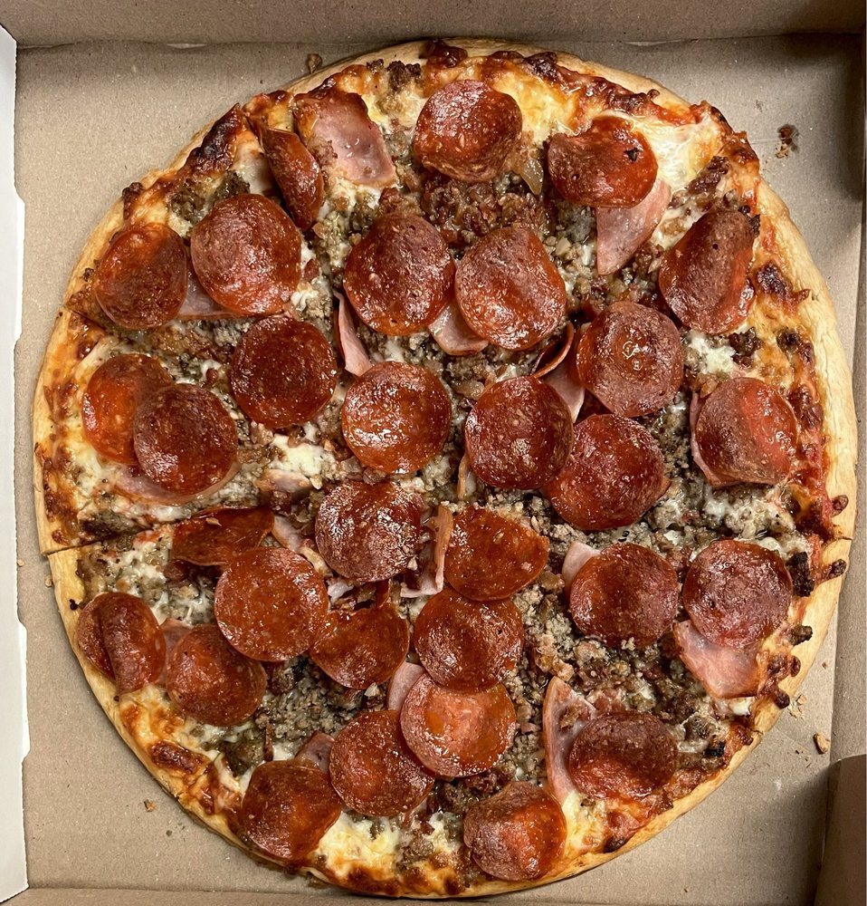 Baked with red sauce, mozzarella, pepperoni, pork sausage, beef and Canadian bacon.