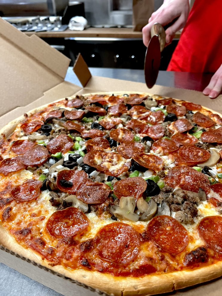Baked with red sauce, mozzarella, pepperoni, pork sausage, beef, mushrooms, black olives, onions ,and bell peppers.