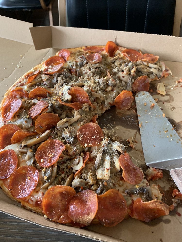 Baked with red sauce, mozzarella, beef, mushrooms, and pepperoni.